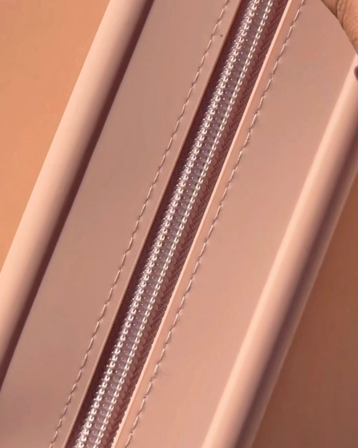 Meet the Dose Bag, a soft-touch silicone pouch in dreamy light pink that's as stylish as it is practical. Water-repellent and easy to wipe clean. Carry it by the wrist strap, toss it in your tote, and let her handle your makeup, skincare, or everyday must-haves with ease. Compact, durable, and unapologetically chic. She's ready to go wherever you go.